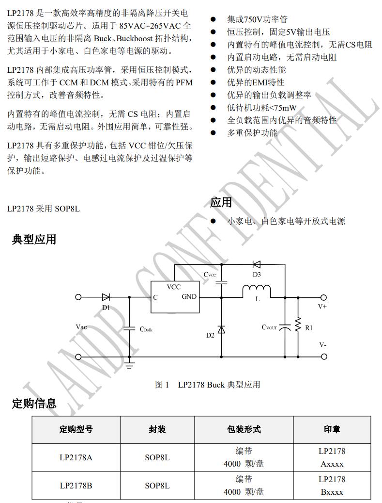 LP2178 是一款高效率高精度的非隔離降壓開關電 源恒壓控制驅動芯片。適用于 85VAC~265VAC 全 范圍輸入電壓的非隔離 Buck、Buckboost 拓撲結構, 尤其適用于小家電、白色家電等電源的驅動。