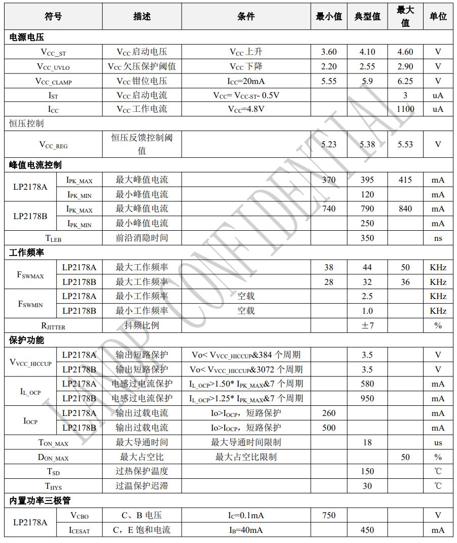 LP2178 內部集成高壓功率管,采用恒壓控制模式, 系統可工作于 CCM 和 DCM 模式。采用特有的 PFM 控制方式,改善音頻特性。 內置特有的峰值電流控制,無需 CS 電阻;內置啟 動電路,無需啟動電阻。外圍應用簡單,可靠性強。