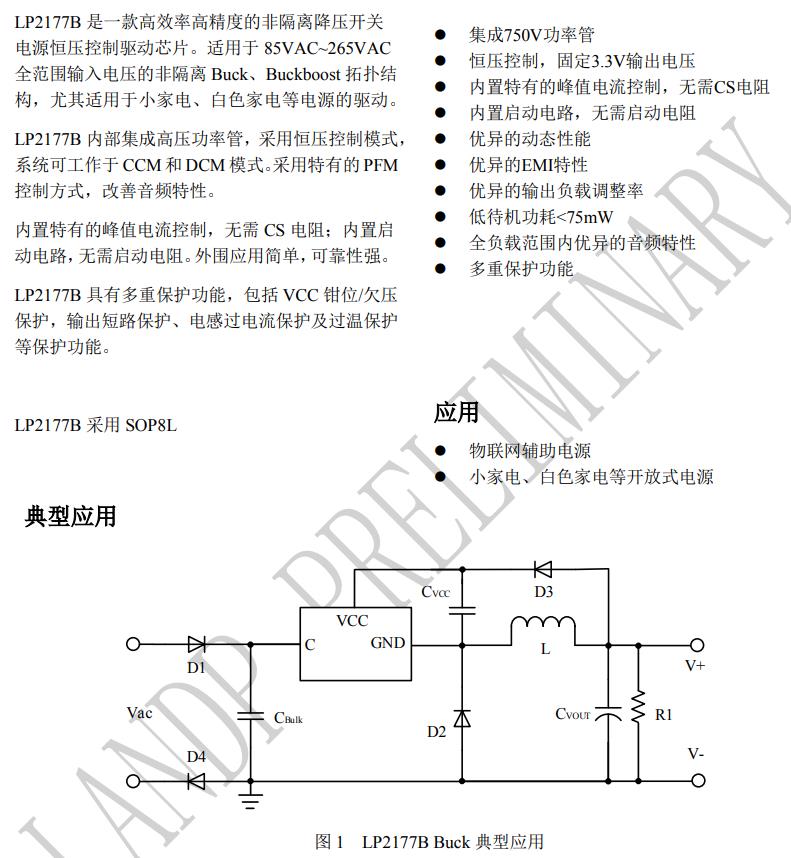 LP2177B 內(nèi)部集成高壓功率管,采用恒壓控制模式, 系統(tǒng)可工作于 CCM 和 DCM 模式。采用特有的 PFM 控制方式,改善音頻特性。 內(nèi)置特有的峰值電流控制,無需 CS 電阻;內(nèi)置啟 動電路,無需啟動電阻。外圍應(yīng)用簡單,可靠性強。