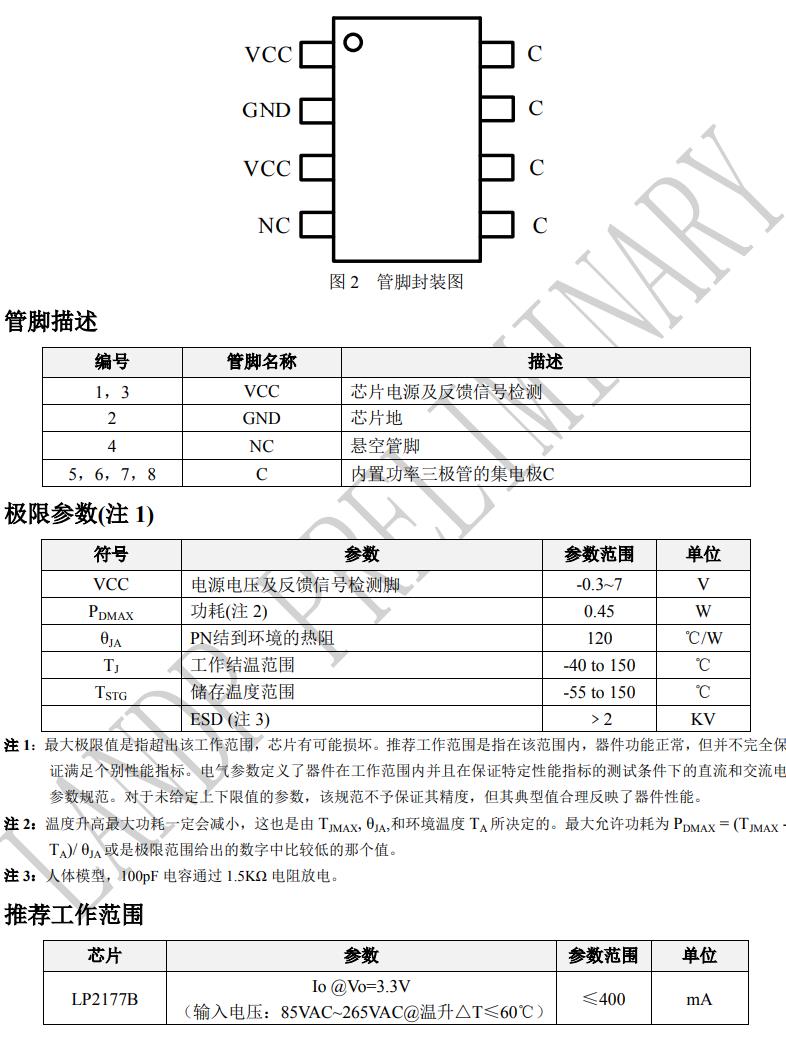 特點 ? 集成750V功率管 ? 恒壓控制,固定3.3V輸出電壓 ? 內(nèi)置特有的峰值電流控制,無需CS電阻 ? 內(nèi)置啟動電路,無需啟動電阻