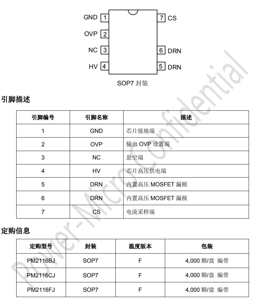 feature ? Compatible with PM2116X pins Integrated 600V ultra fast recovery diode ? No VCC capacitor, no starting resistor ? Integrated high-voltage power supply function ? External moisture-proof OVP function ? No flashing lights under low bus voltage