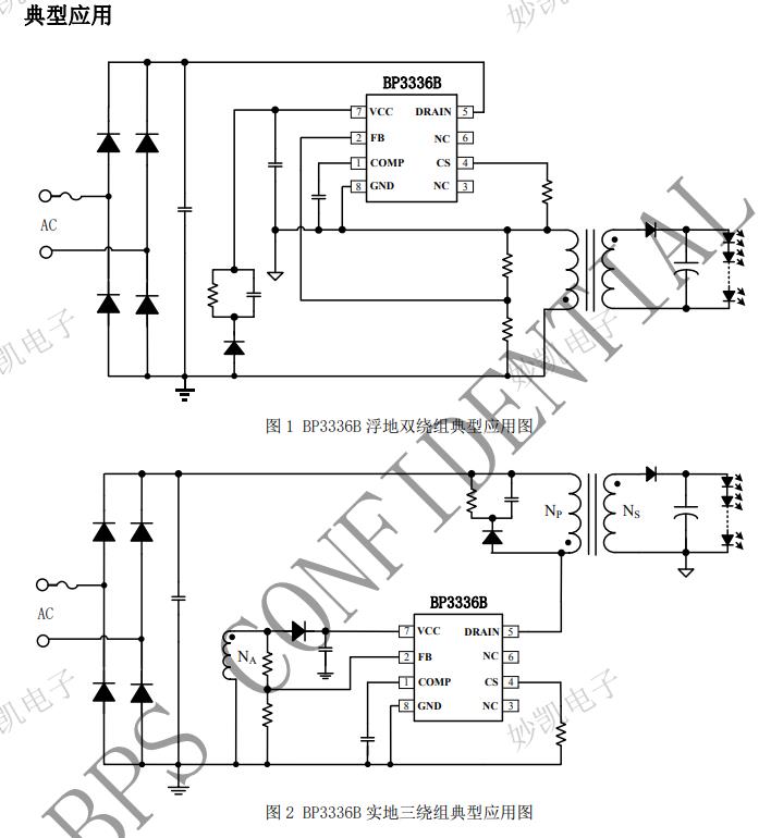 BP3336B 可以支持單繞組浮地 Buck-boost 或者兩  繞組/三繞組的隔離 Flyback 拓撲。  BP3336B 采用 SOP-8 封裝。