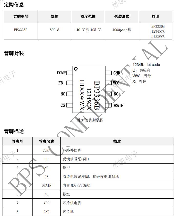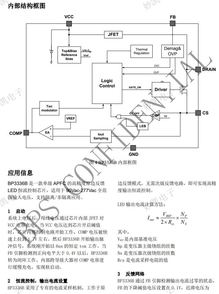 BP3336B 芯片采用固定導通時間的控制機制,能夠  實現高功率因數。內置 THD 優化模塊可以進一步  降低了 THD,針對全電壓輸入,可以實現 THD<15%。  開關工作在臨界導通模式,降低開關損耗及 EMI。  BP3336B 內置高壓啟動,搭配快速啟動控制,可以  在全電壓輸入下實現小于 500ms 以內的啟動時間。  BP3336B 內置輸入電壓和負載補償線路,可以實現  極佳的線性調整率和負載調整率。