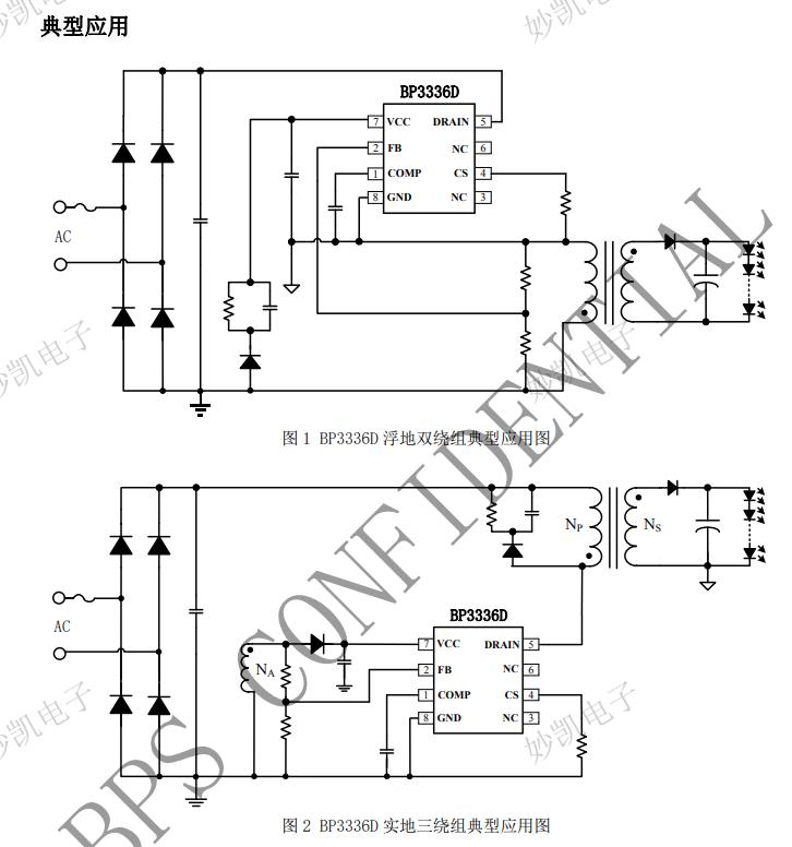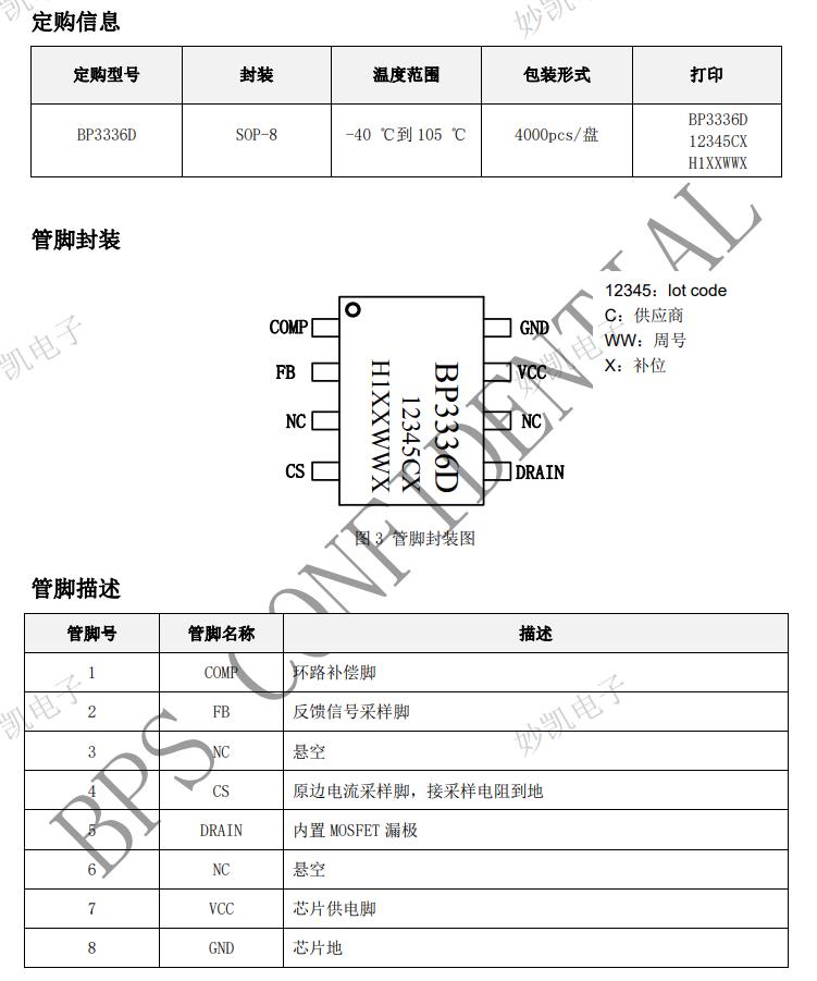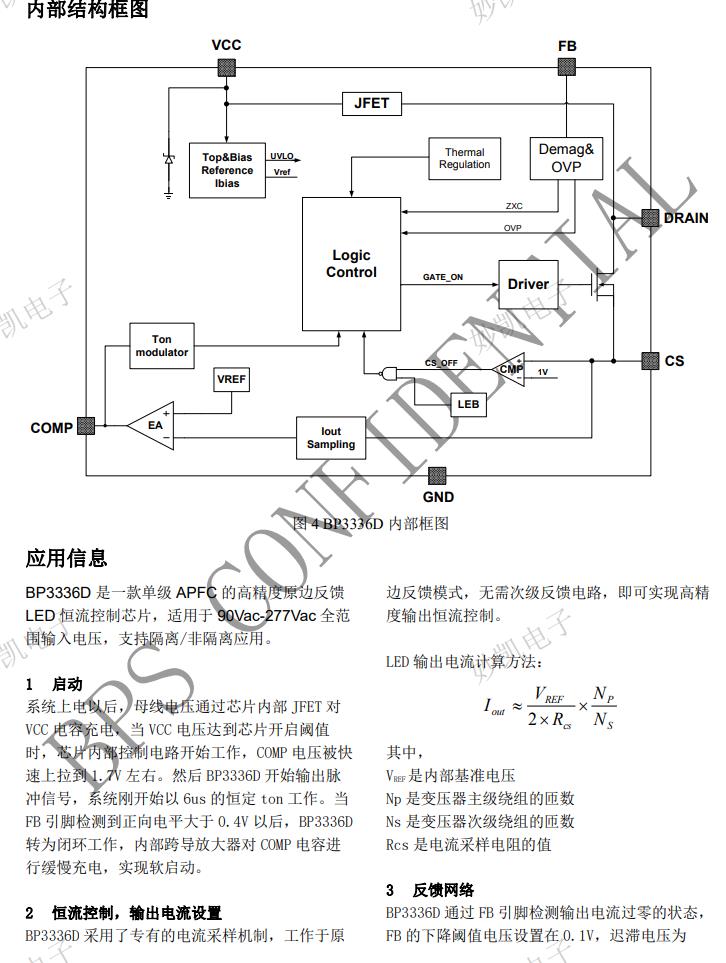 BP3336D 是一款單級 APFC 的高精度原邊反饋 LED  恒流驅動器,內置 650V 高壓 MOSFET,適用于  90Vac-277Vac 全范圍輸入電壓。  BP3336D 芯片采用固定導通時間的控制機制,能夠  實現高功率因數。內置 THD 優化模塊可以進一步  降低了 THD,針對全電壓輸入,可以實現 THD<15%。  開關工作在臨界導通模式,降低開關損耗及 EMI。  BP3336D 內置高壓啟動,搭配快速啟動控制,可以  在全電壓輸入下實現小于 500ms 以內的啟動時間。