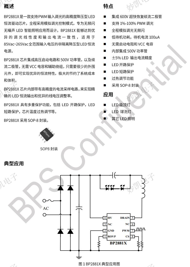BP2881D是一款支持PWM輸入調光的高精度降壓型LED恒流驅動芯片,全程采用模擬調光控制模式,專為無頻閃無噪聲LED智能照明應用而設計。