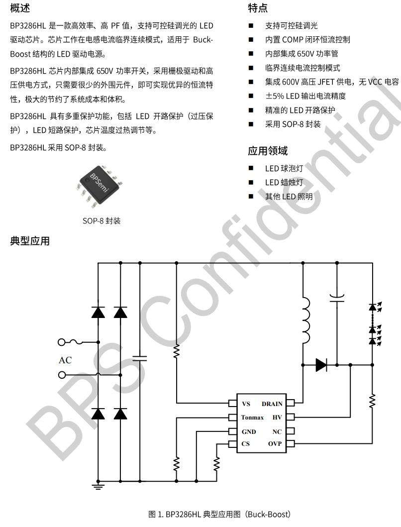 BP3286是一款高效率、高PF值,支持可控硅調(diào)光的LED 驅(qū)動(dòng)芯片。芯片工作在電感電流臨界連續(xù)模式,適用于Buck-Boost結(jié)構(gòu)的LED 驅(qū)動(dòng)電源。