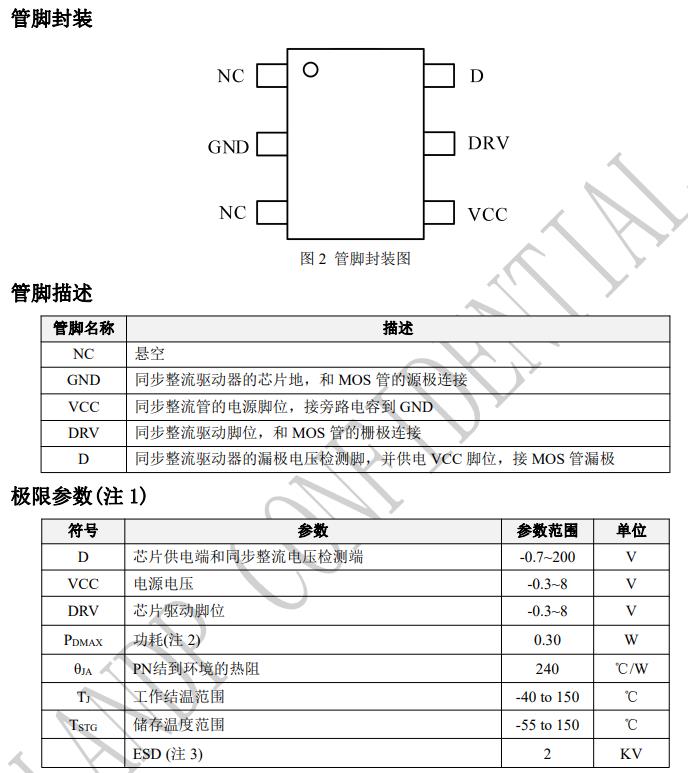 ? 極快的關斷速度 ? 可調的同步 MOS 關斷閾值 ? 集成 VCC 供電技術 ? 芯片供電欠壓保護 ? 芯片過壓鉗位 ? 芯片啟動前驅動腳防誤導通 ? 外圍元器件少