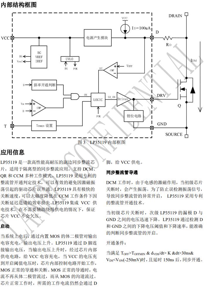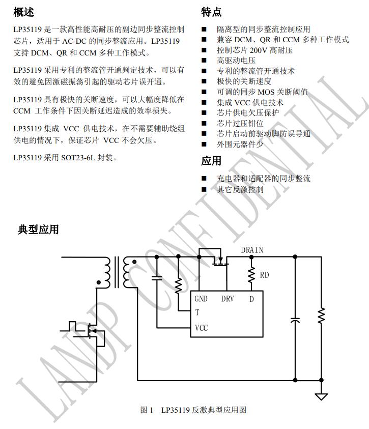 LP35119 是一款高性能高耐壓的副邊同步整流控制 芯片,適用于 AC-DC 的同步整流應(yīng)用。LP35119 支持 DCM、QR 和 CCM 多種工作模式。 LP35119 采用專利的整流管開通判定技術(shù),可以有 效的避免因激磁振蕩引起的驅(qū)動芯片誤開通。