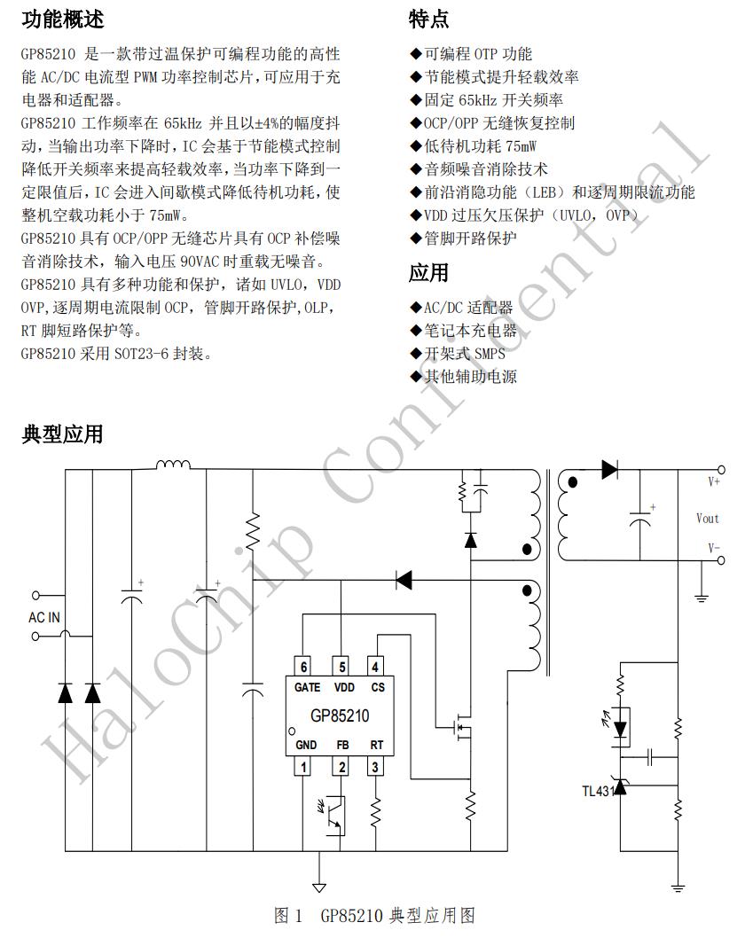 GP85210是一款帶過溫保護可編程功能的高性能AC/DC電流型PWM功率控制芯片,可應用于充電器和適配器。