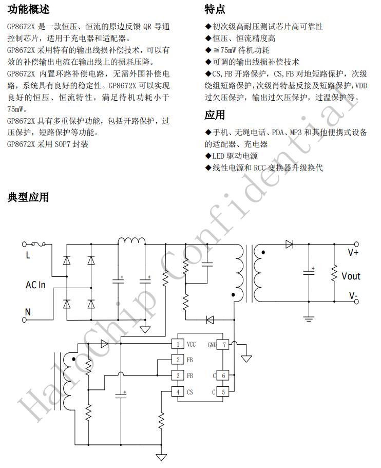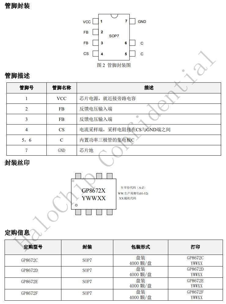 GP8672X具有多重保護(hù)功能,包括開(kāi)路保護(hù),過(guò)壓保護(hù),短路保護(hù)等功能。GP8672X采用SOP7封裝