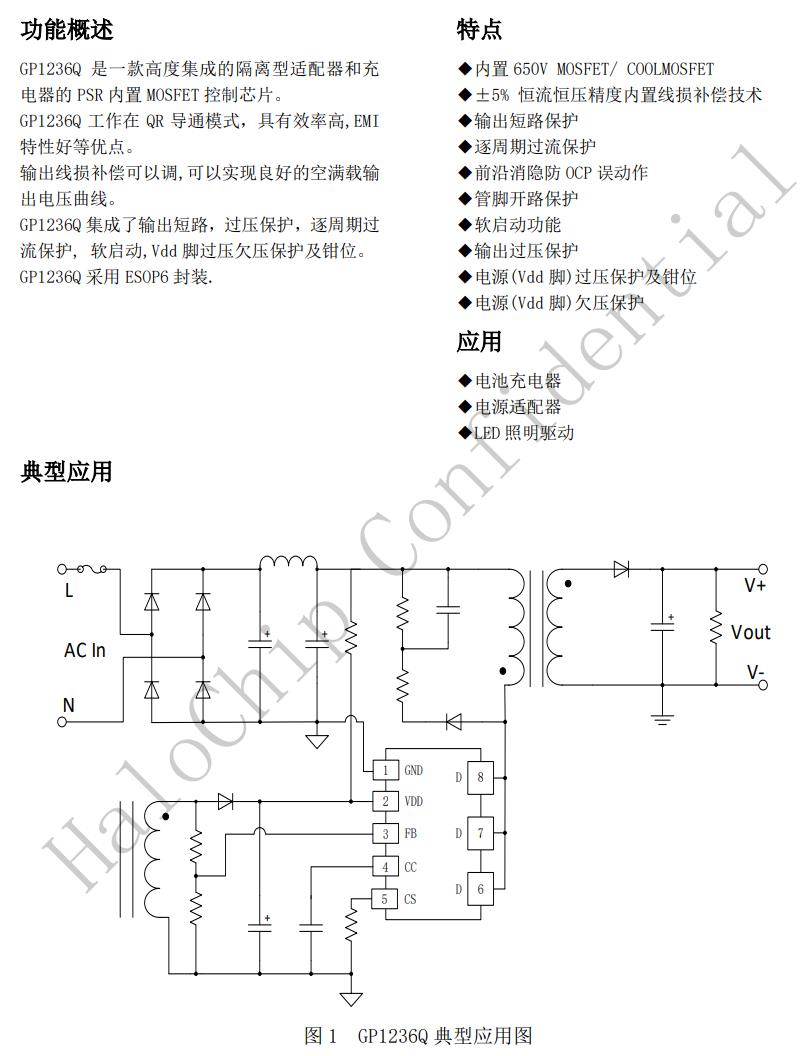 GP1236Q是一款高度集成的隔離型適配器和充電器的PSR內置MOSFET控制芯片。GP1236Q工作在QR導通模式,具有效率高,EMI特性好等優點。輸出線損補償可以調,可以實現良好的空滿載輸出電壓曲線。