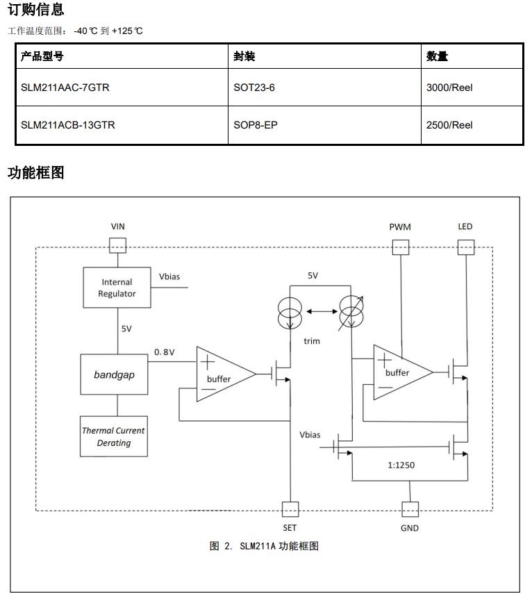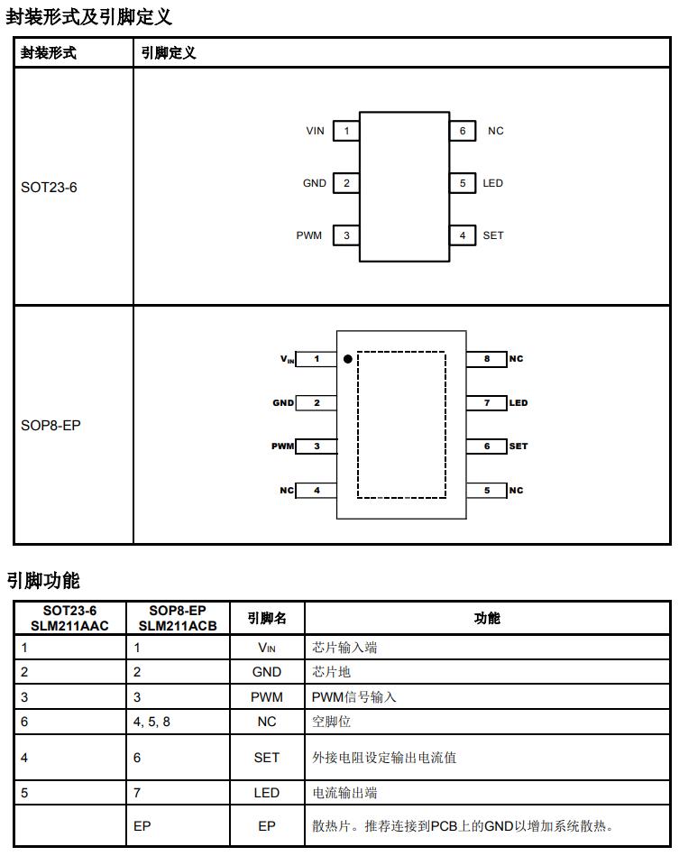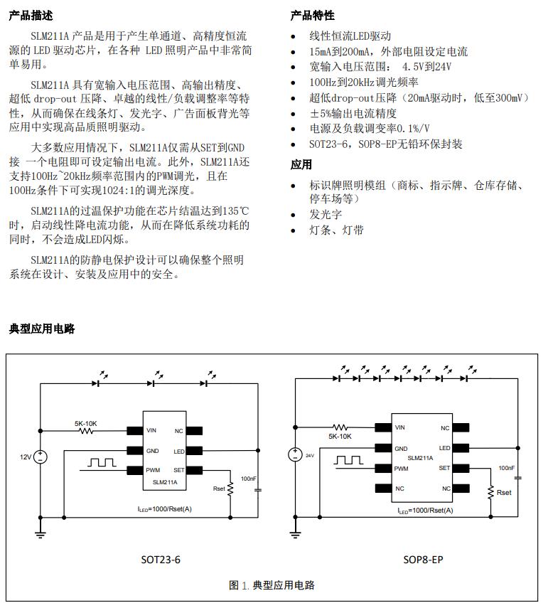 SLM211A 產品是用于產生單通道、高精度恒流源的 LED 驅動芯片,在各種 LED 照明產品中非常簡單易用。SLM211A 具有寬輸入電壓范圍、高輸出精度、超低 drop-out 壓降、卓越的線性/負載調整率等特性,從而確保在線條燈、發光字、廣告面板背光等應用中實現高品質照明驅動。大多數應用情況下,SLM211A僅需從SET到GND接 一個電阻即可設定輸出電流。此外,SLM211A還支持100Hz~20kHz頻率范圍內的PWM調光,且在100Hz條件下可實現1024:1的調光深度。SLM211A的過溫保護功能在芯片結溫達到135℃時,啟動線性降電流功能,從而在降低系統功耗的同時,不會造成LED閃爍。SLM211A的防靜電保護設計可以確保整個照明系統在設計、安裝及應用中的安全。