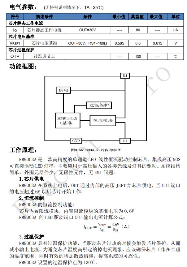 應(yīng)用領(lǐng)域: ? LED 日光燈管 T5/T8/T10 ? LED 燈絲燈/球泡燈/蠟燭燈 ? 其它小功率 LED 照 RM9003A 的輸出電阻由外接 Rext 電阻設(shè)置,最大飽合電流 80mA,具有 良好的恒流特性。 明