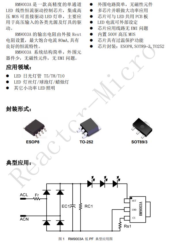 RM9003A 是一款高精度的單通道 LED 線性恒流驅(qū)動(dòng)控制芯片,集成高 壓 MOS 可直接驅(qū)動(dòng) LED 燈串,主要應(yīng) 用于高壓輸入的各類(lèi)光源及燈具的驅(qū) 動(dòng)。 RM9003A 系統(tǒng)結(jié)構(gòu)簡(jiǎn)單,外圍元 器件少,無(wú)磁性元件,無(wú) EMI 問(wèn)題。